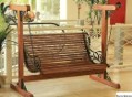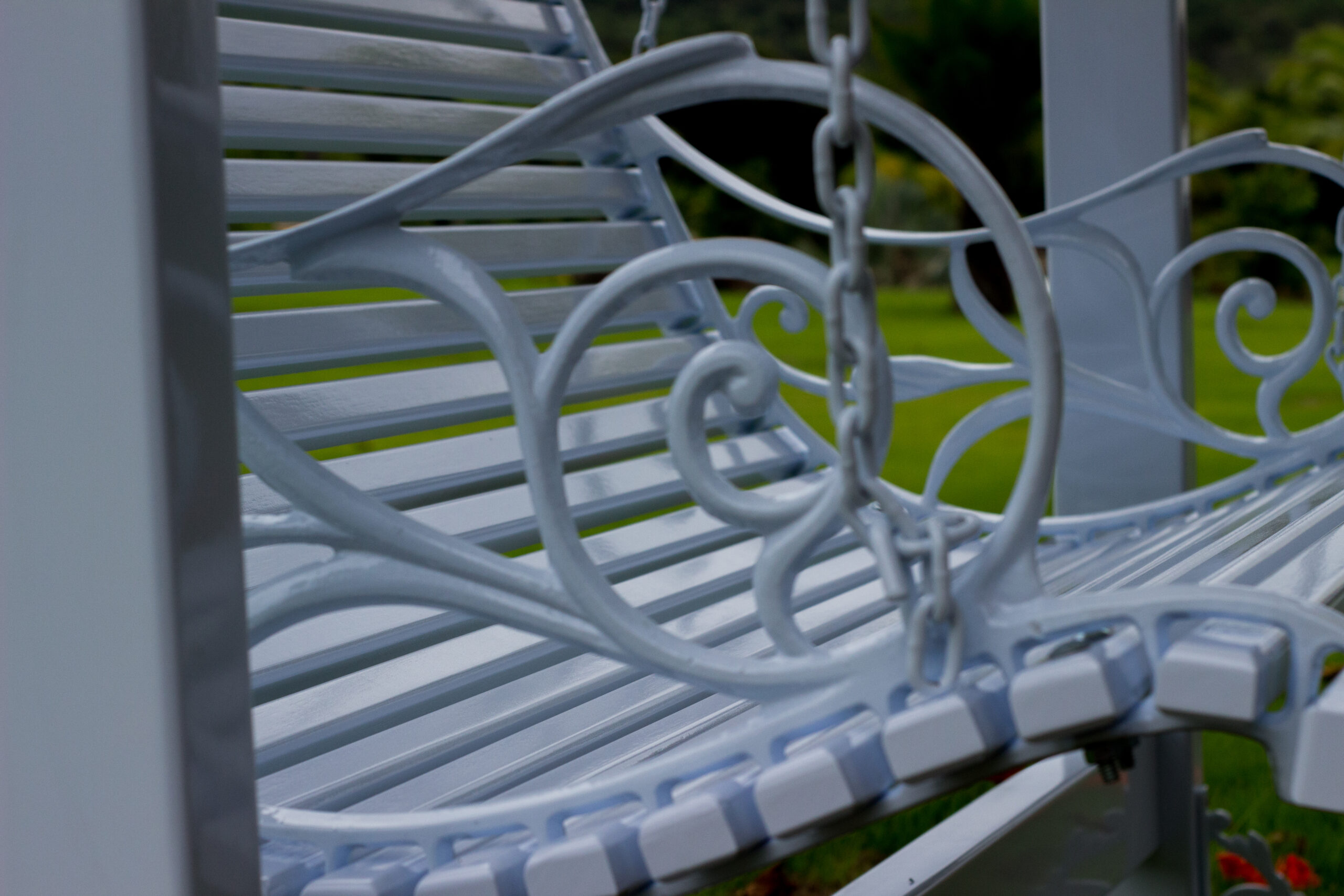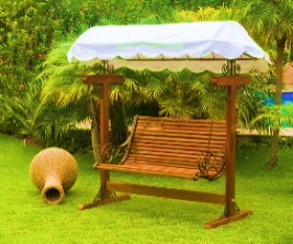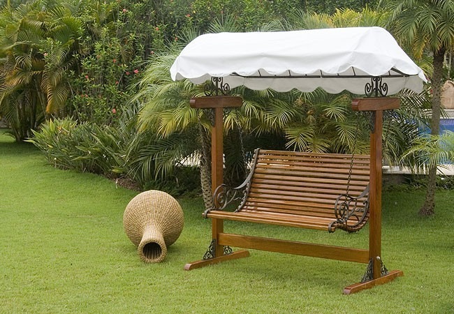 Banco balanço em madeira, detalhes em alumínio fundido, com toldo.