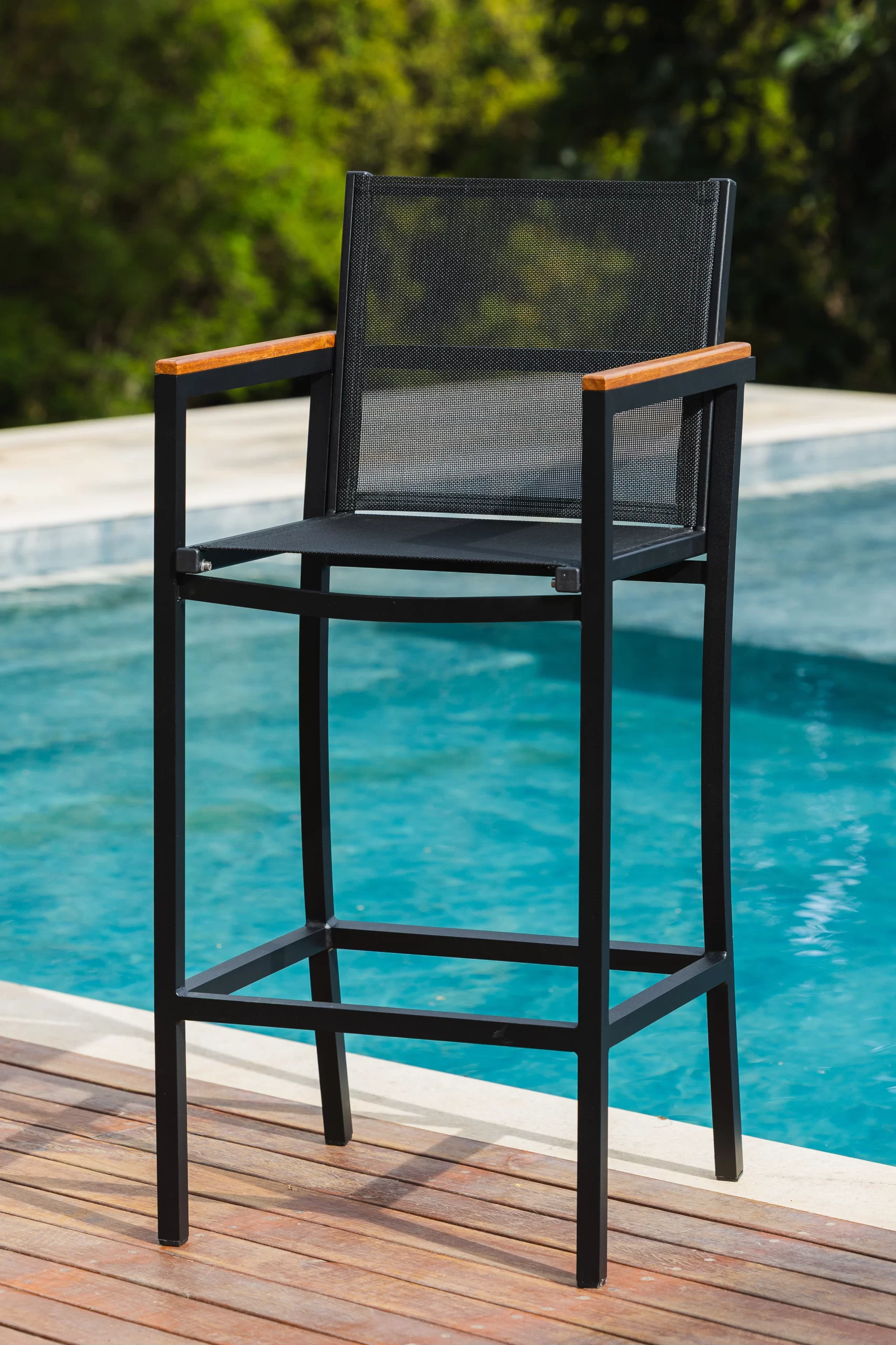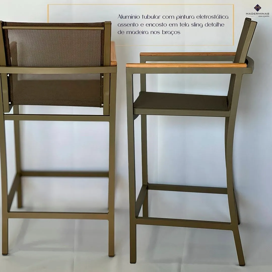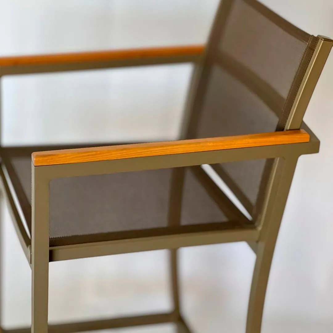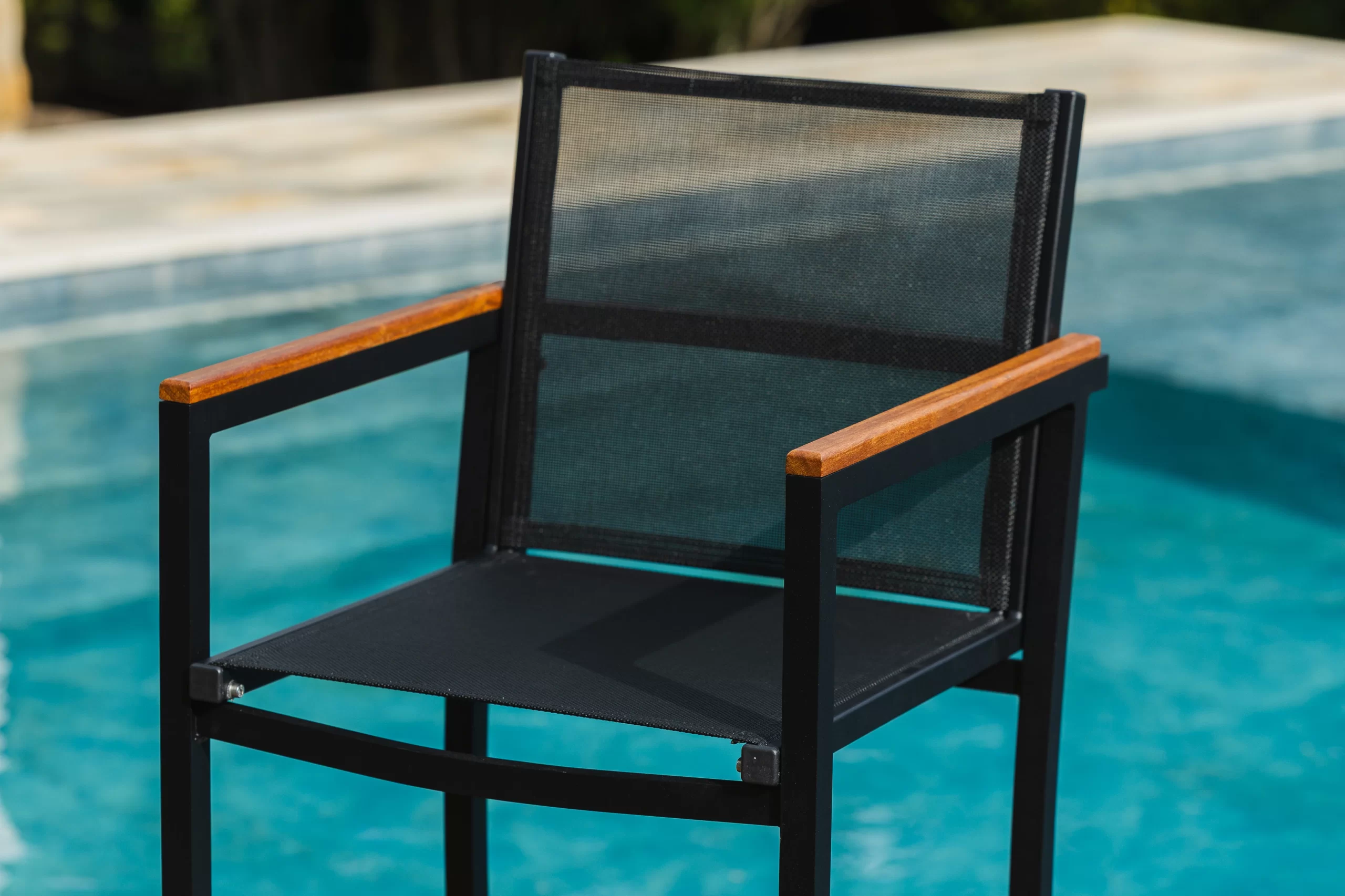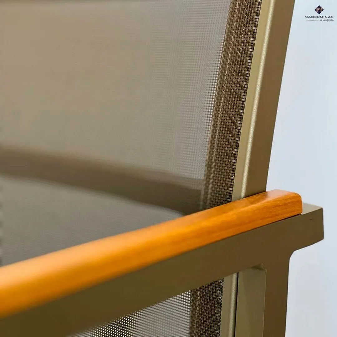 Com estrutura de alumínio tubular com pintura eletrostática, assento e encosto em tela sling e detalhes encantadores em madeira nos braços.