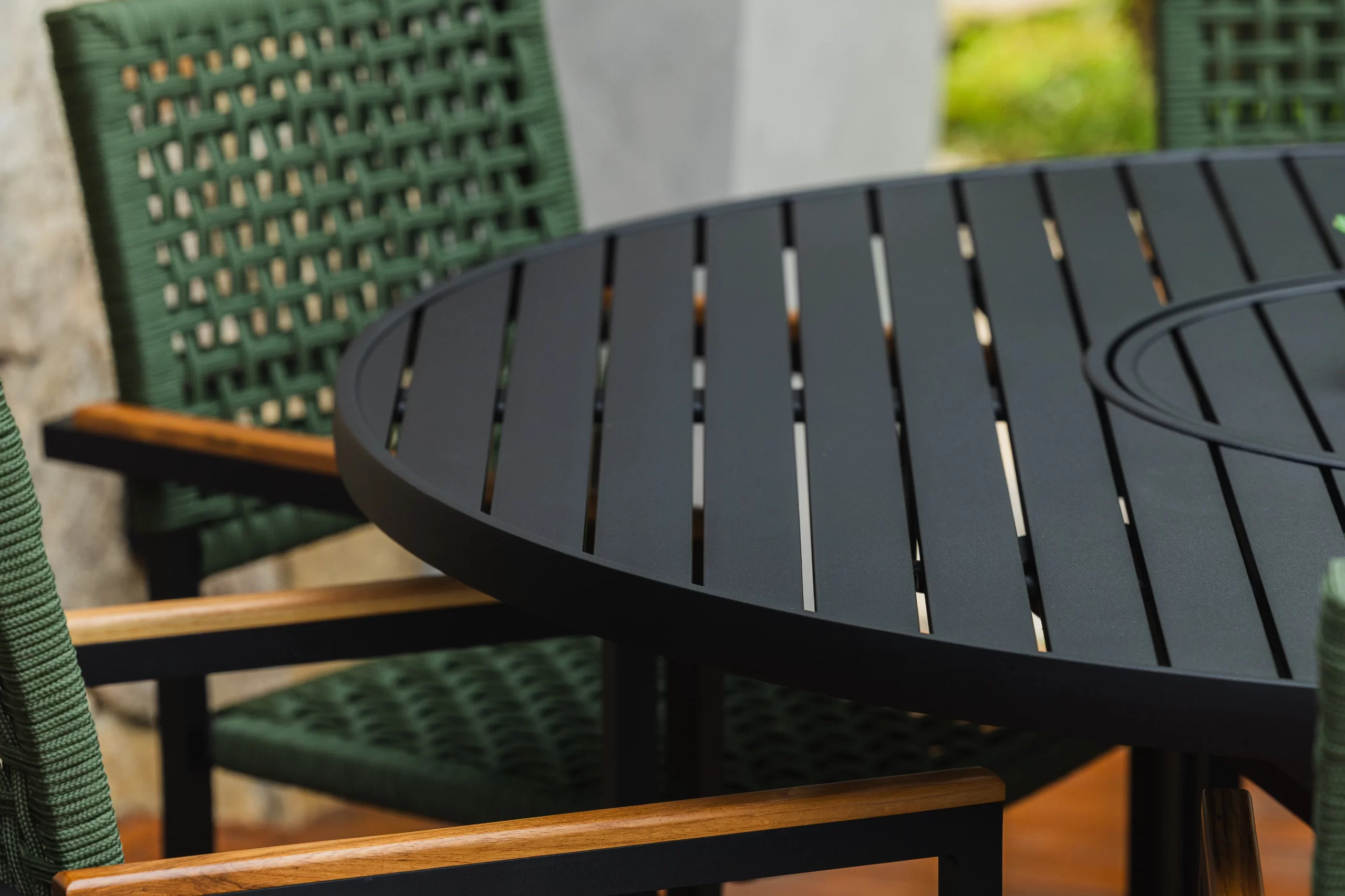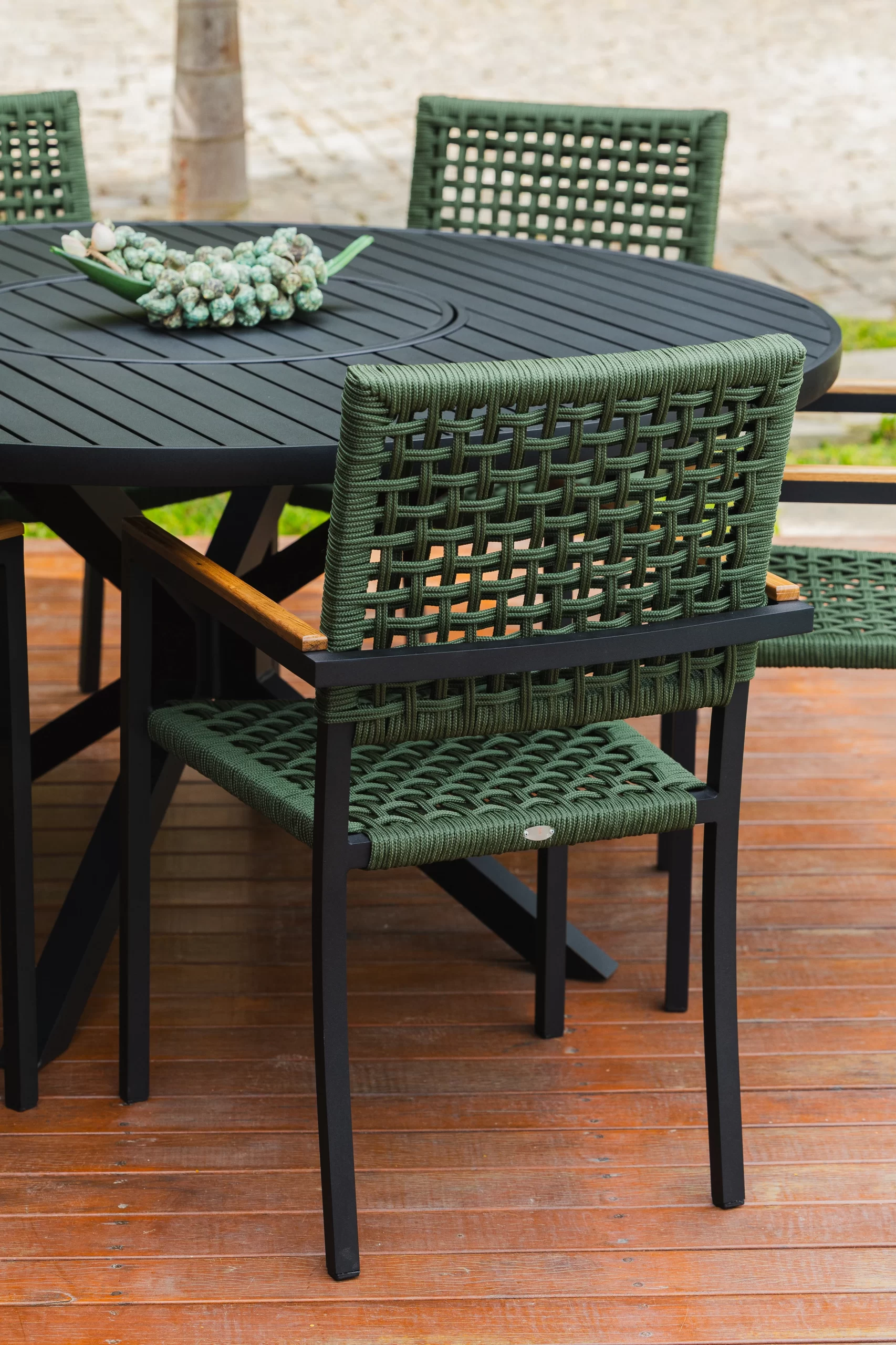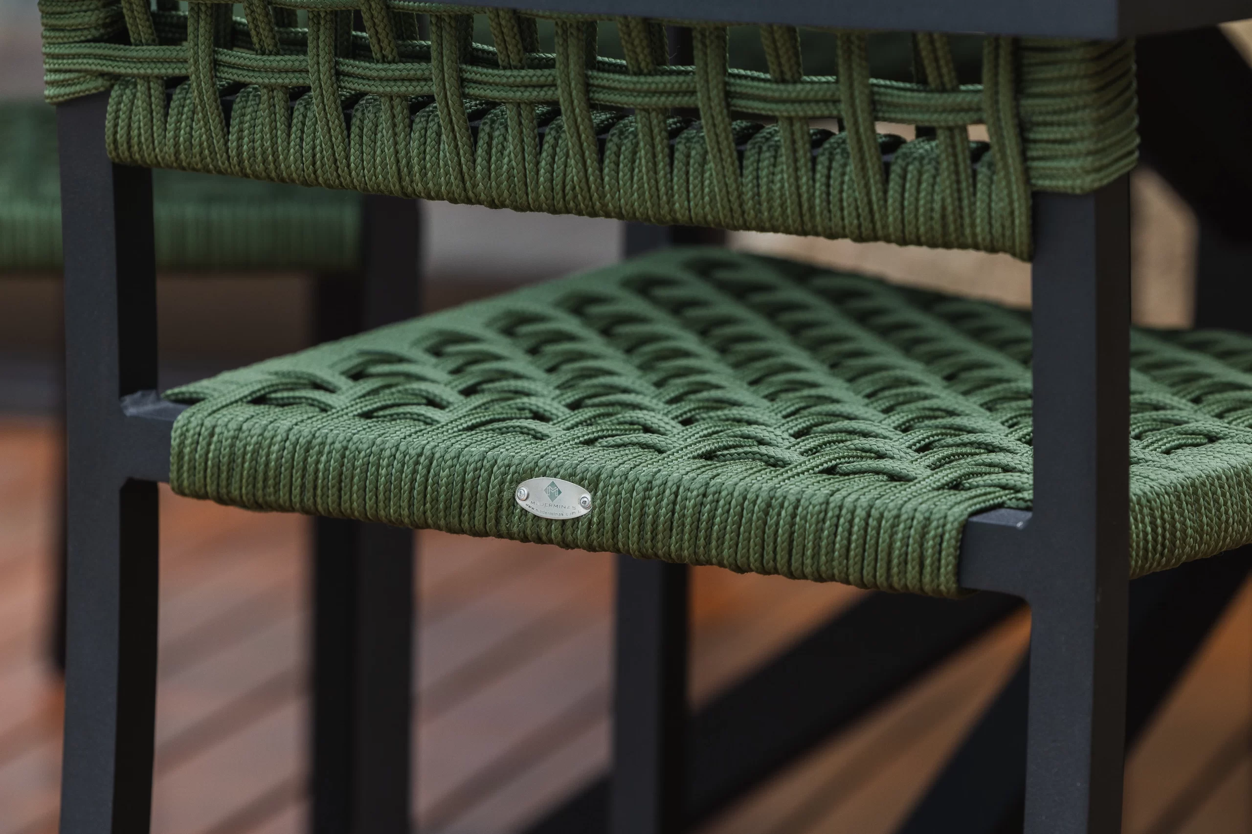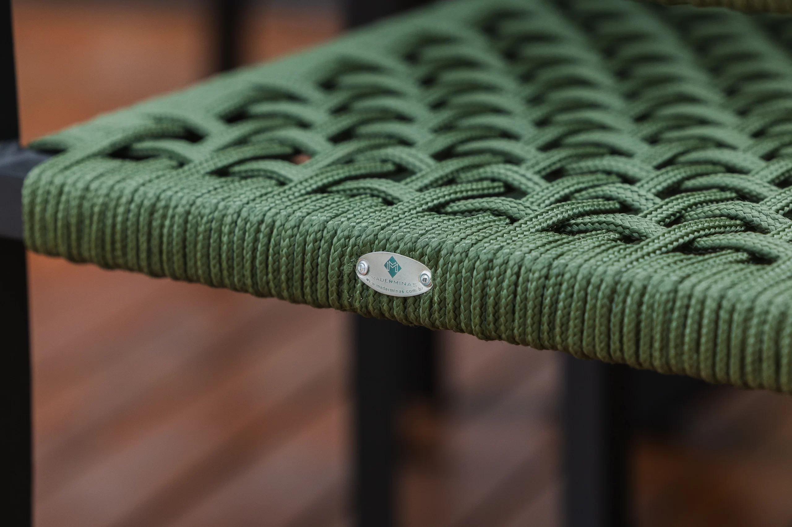 Trama em corda náutica. Detalhe com braço de madeira.