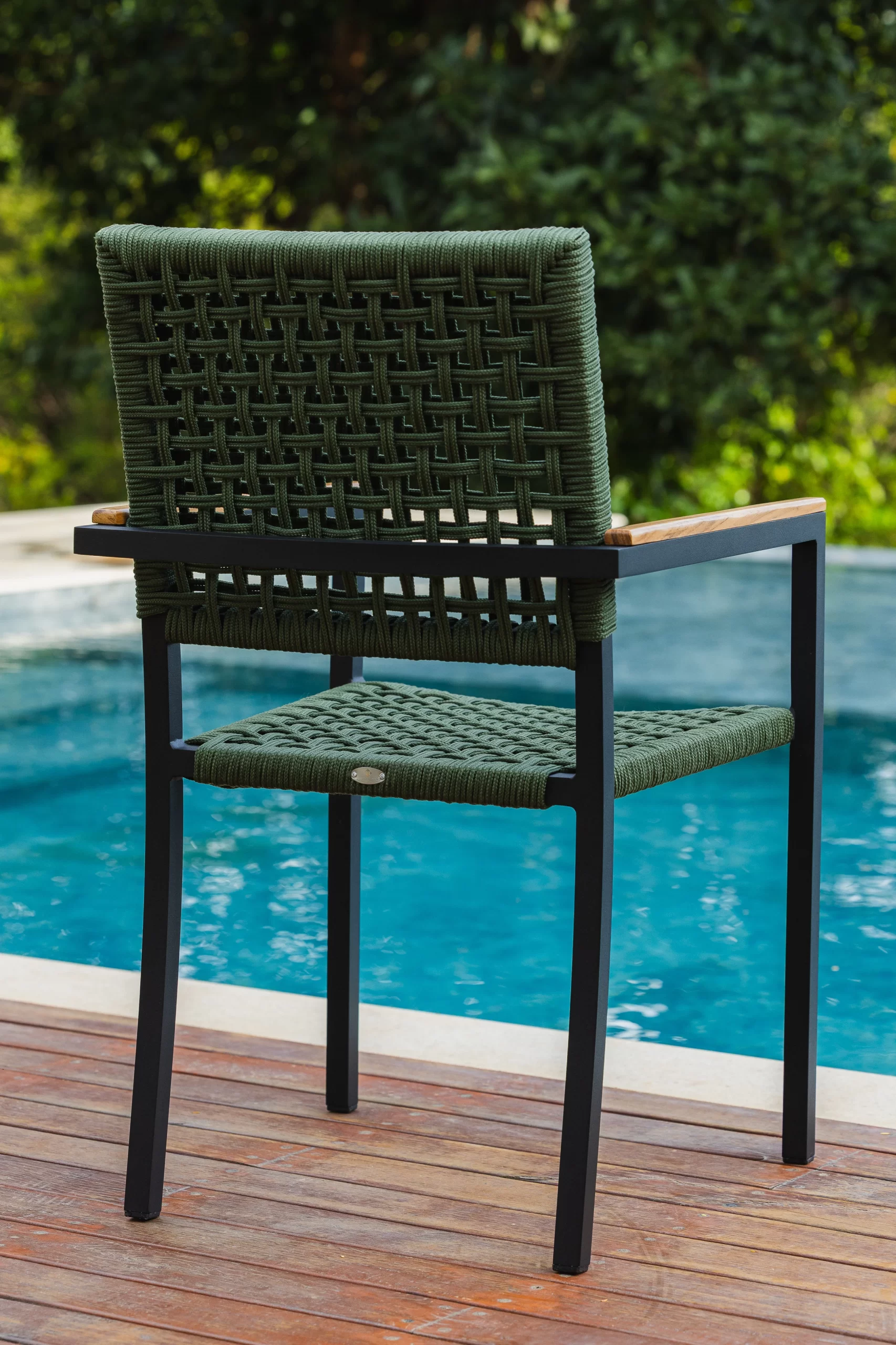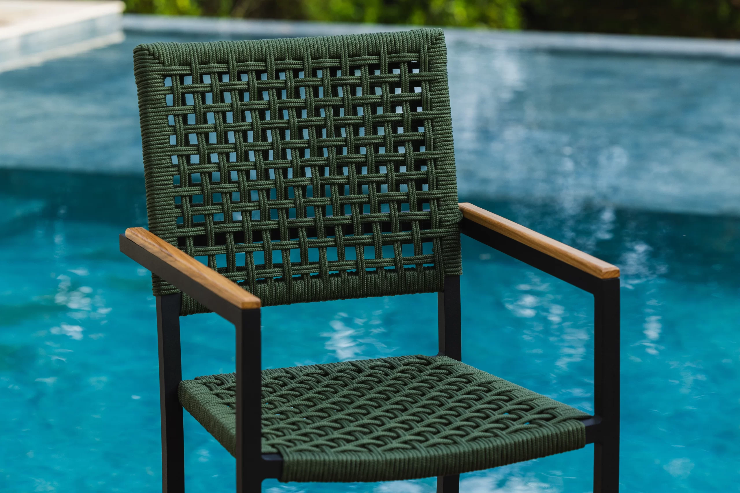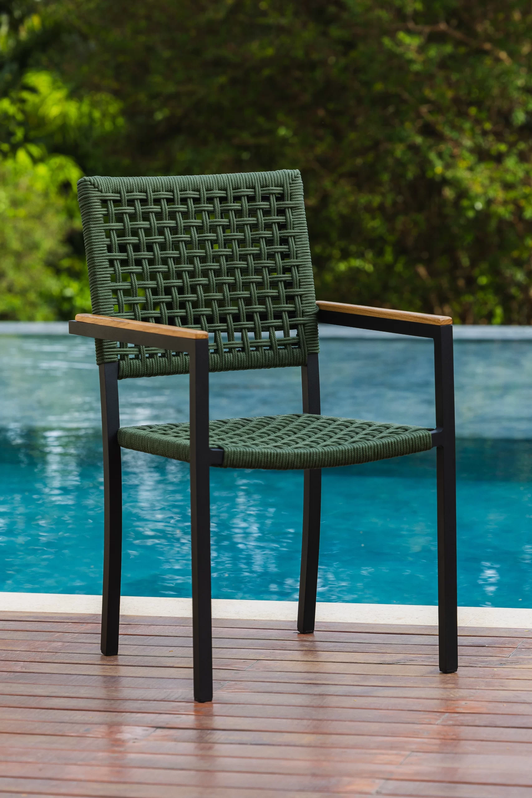 Cadeira com estrutura em alumínio revestido com pintura eletrostática e trama em corda náutica.