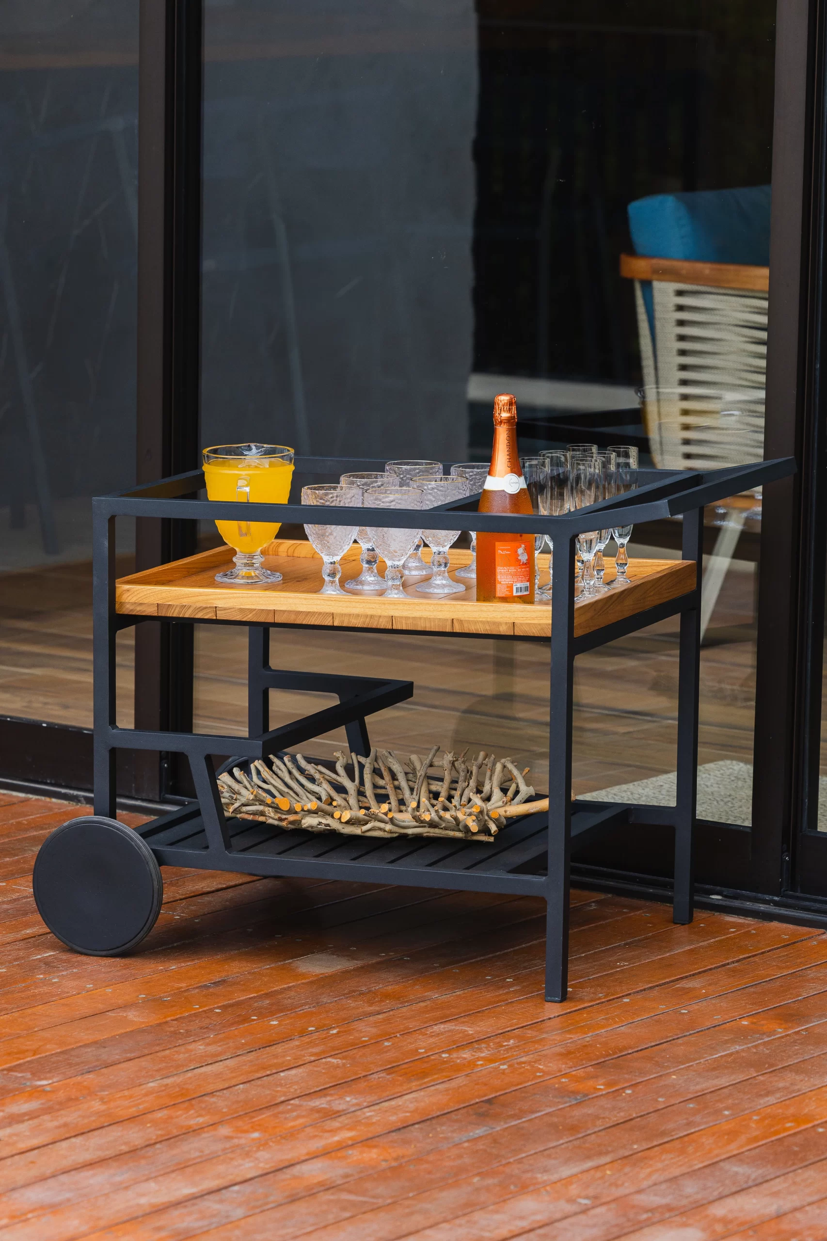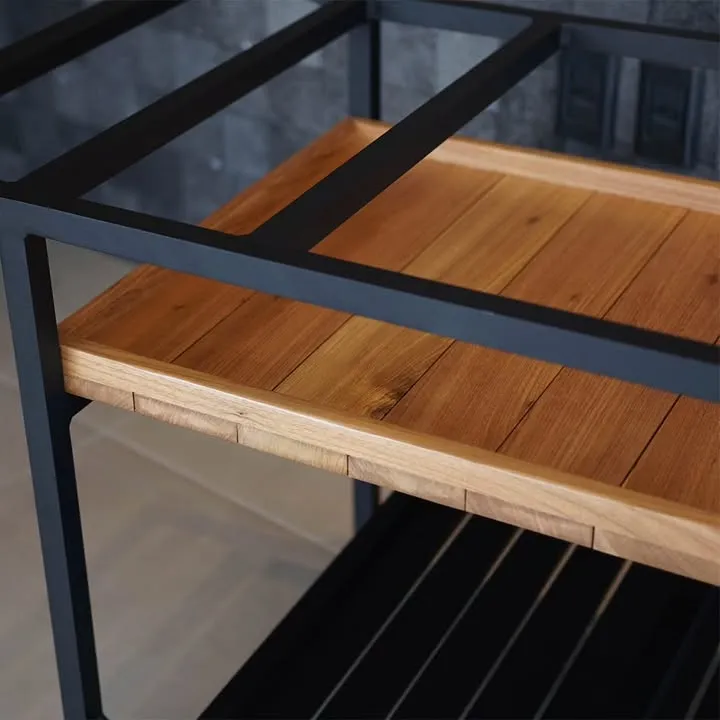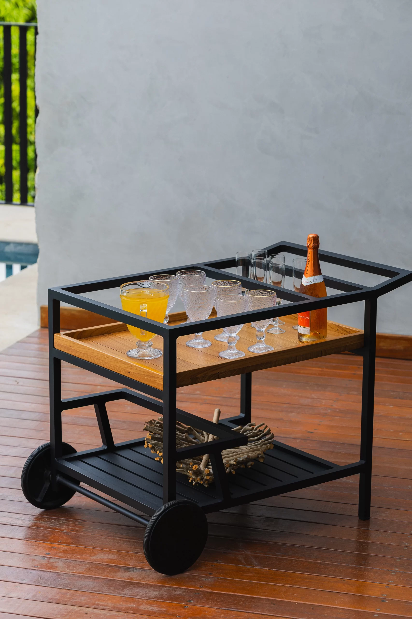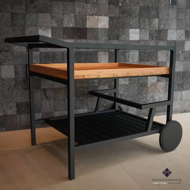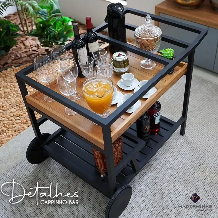 Carrinho bar com estrutura de alumínio revestido com pintura eletrostática, uma bandeja em madeiras ripada e uma bandeja em alumínio ripado.