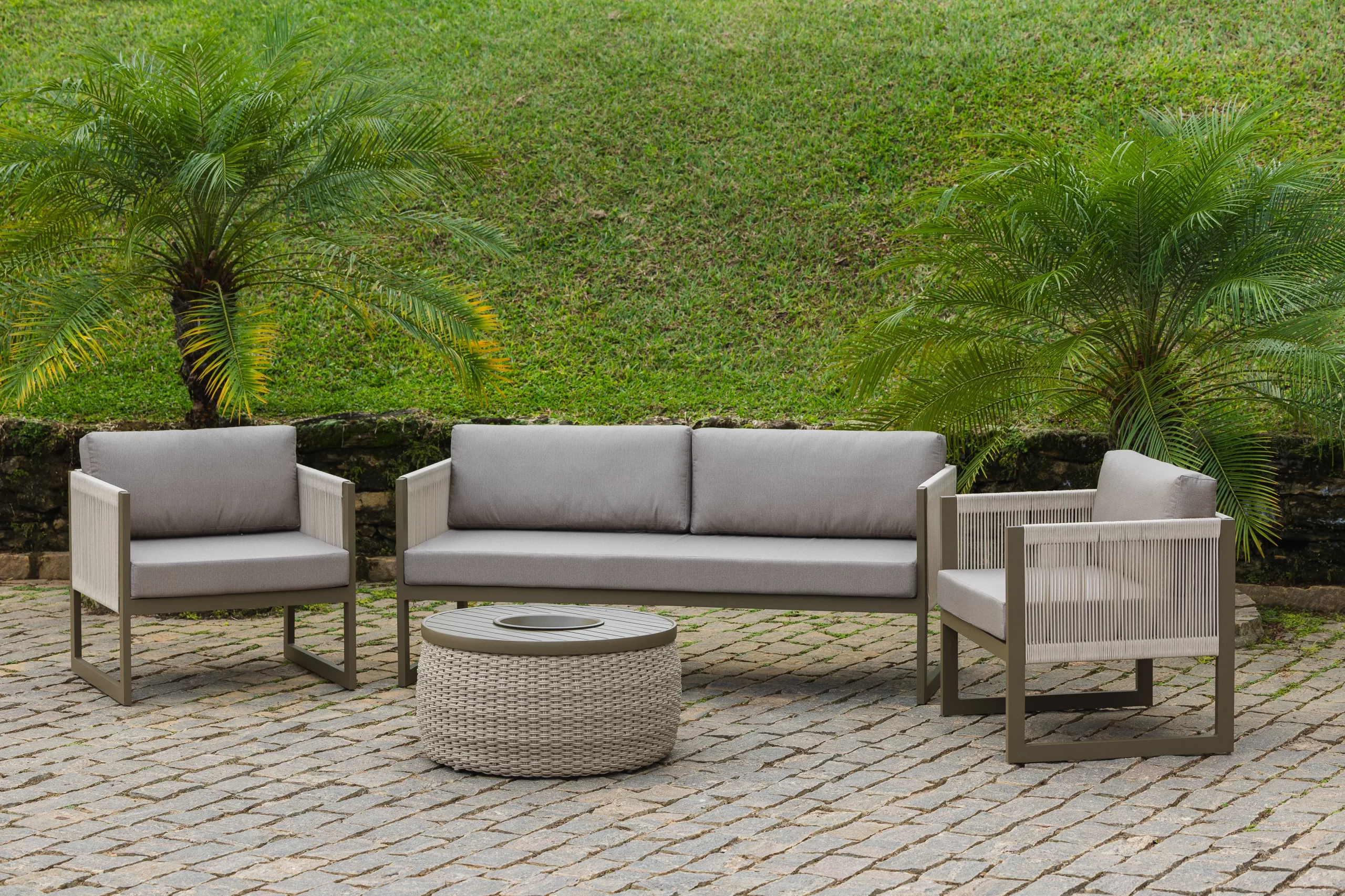 Conjunto Grécia, acompanhado de um sofá, e duas poltronas.