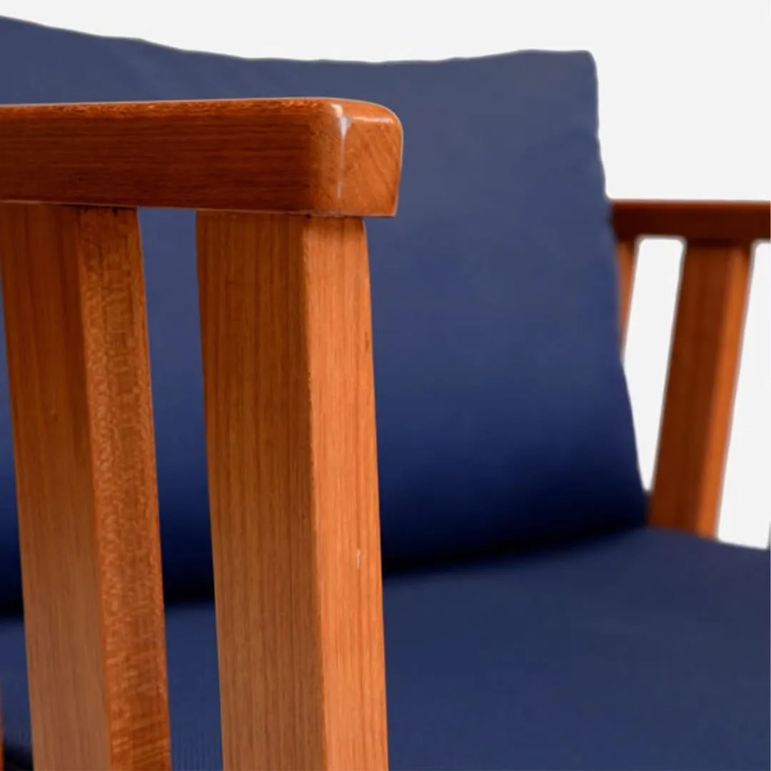 Sofá com estrutura em madeira. Poltrona com estrutura em madeira. Mesa de centro com estrutura em madeira.