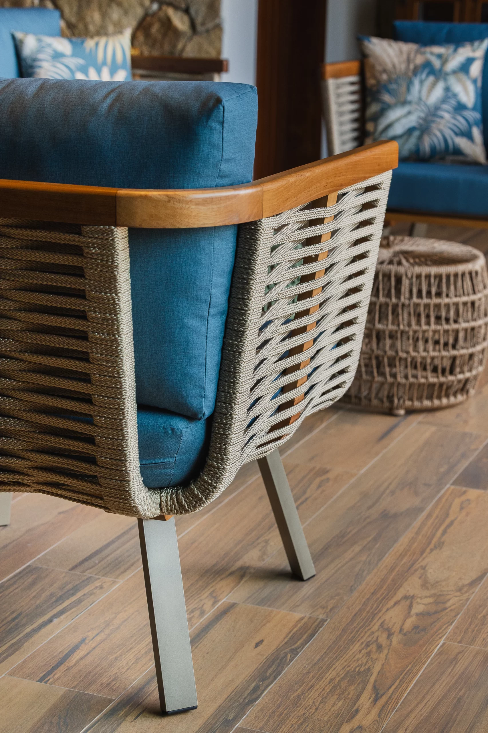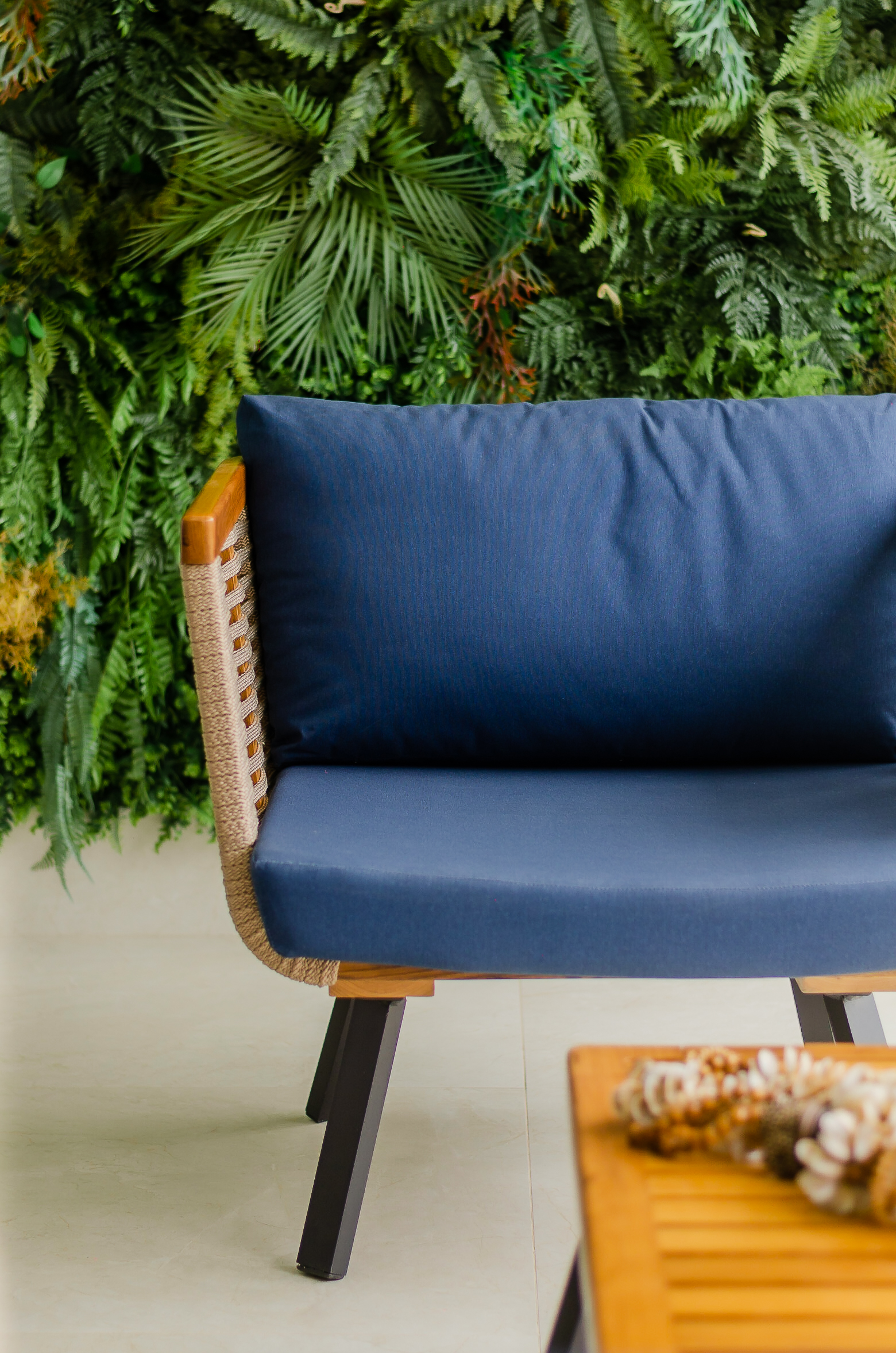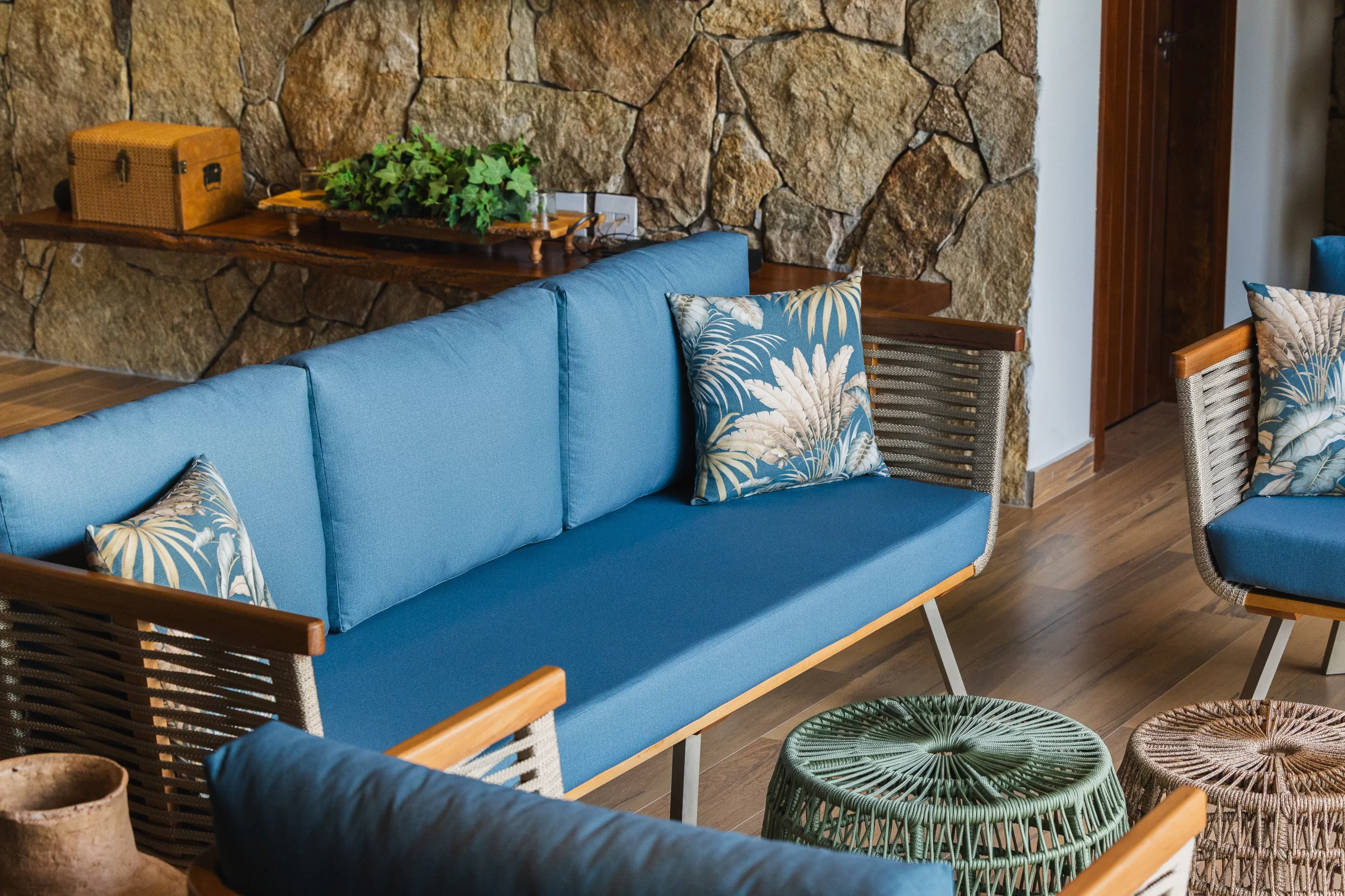 Conjunto Veneza, acompanhado de um sofá, acompanho de duas poltronas e uma mesa de centro.