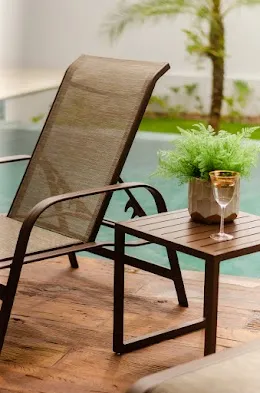 Espreguiçadeira com estrutura em alumínio revestido com pintura eletrostática.