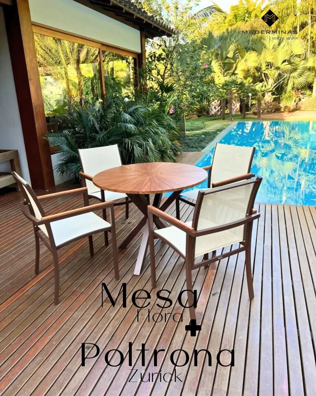 Mesa de Jantar com estrutura em alumínio revestido com pintura eletrostática e tampo em madeira, sem giro.