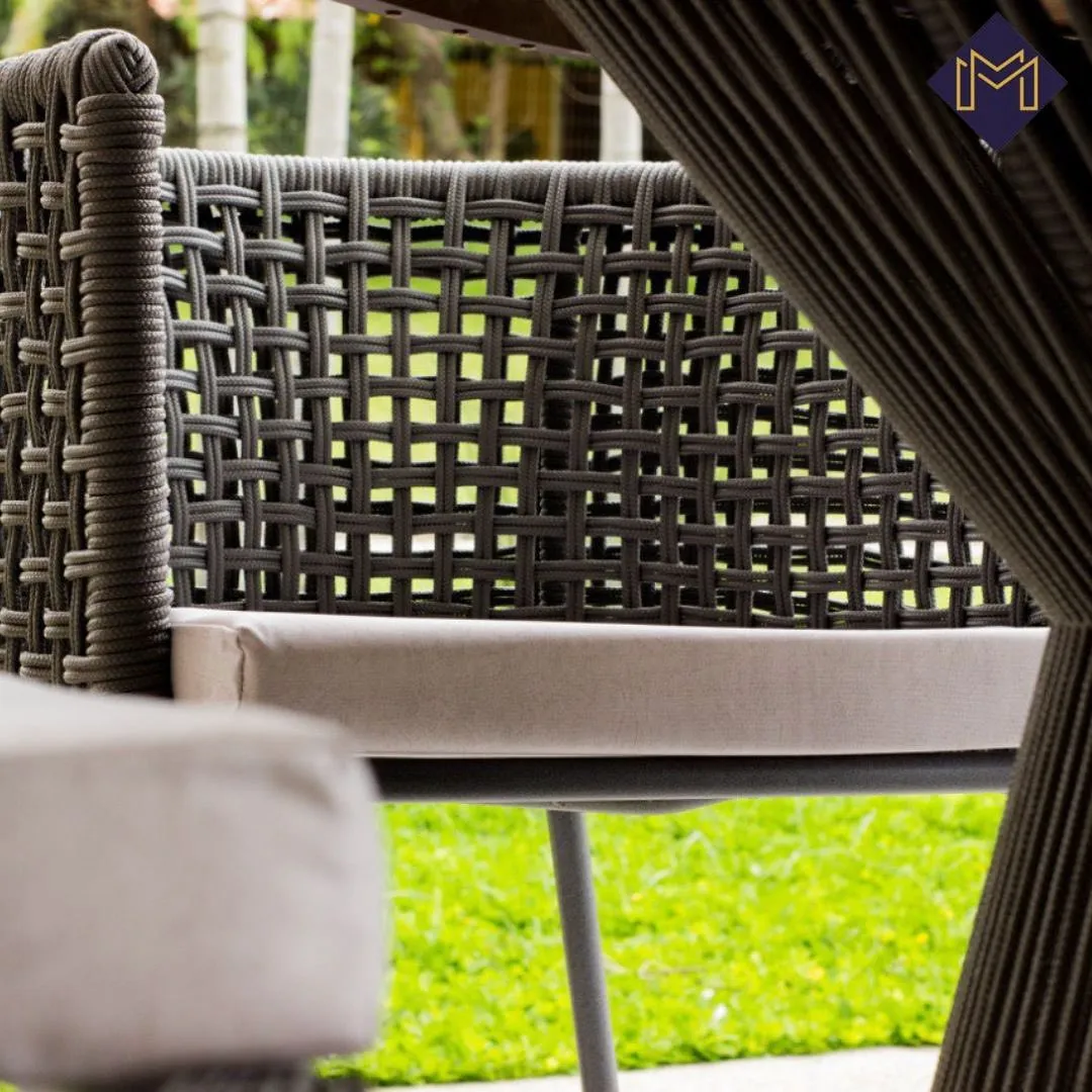 Mesa de Jantar com estrutura em alumínio revestido com pintura eletrostática, trama em corda náutica e tampo em MADEIRA.